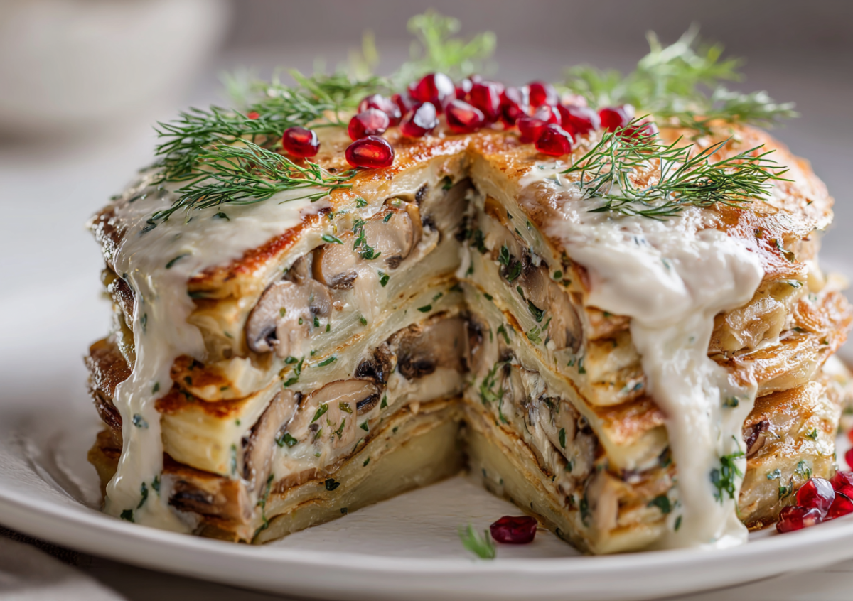 Для приготовления вам понадобится: для коржей — 1 кг картофеля, 2 яйца, 3 ст. л. муки, соль, перец; для начинки — 600 г шампиньонов, 2 крупные луковицы, 300 г сметаны, 50 г сливочного масла, зелень укропа, соль. Картофель отварите, приготовьте густое пюре без молока, дайте остыть. Добавьте яйца, муку, соль, перец, вымесите тесто. Разделите его на 4–5 частей. Каждую часть выложите на противень, застеленный пергаментом, и аккуратно распределите в тонкий круглый корж. Выпекайте коржи при 200 °C 15–20 минут до легкой корочки. Для начинки лук и грибы мелко нарежьте, обжарьте на сливочном масле до готовности и выпаривания жидкости. Добавьте сметану, посолите, поперчите, потушите 5 минут, вмешайте зелень. Собирайте торт на плоском блюде, промазывая каждый картофельный корж грибной начинкой. Верх и бока торта обильно смажьте оставшимся соусом. Уберите в холодильник на 3–4 часа для пропитки. Перед подачей украсьте зеленью и гранатовыми зернами.