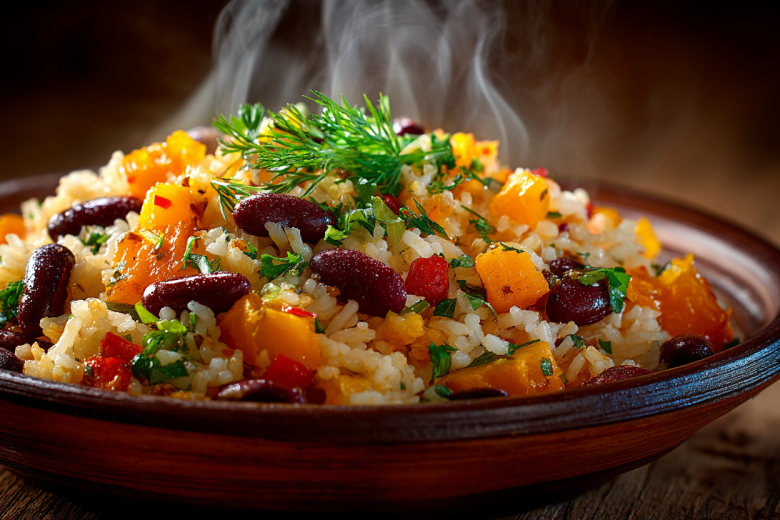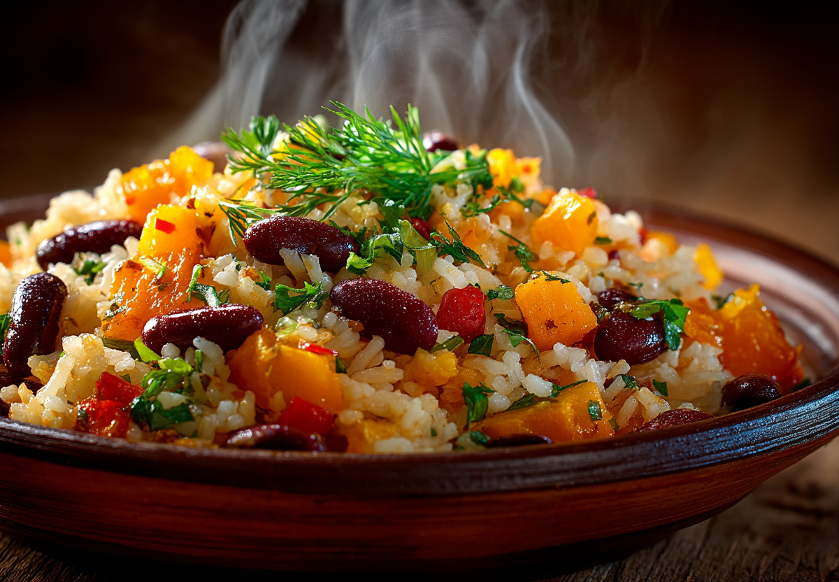 Этот плов — не просто альтернатива мясному варианту, а полноценное гастрономическое событие. Тыква, томленная на дне, отдает сладость и сок, не давая рису пригореть, а фасоль, вобрав ароматы специй, дарит блюду насыщенный вкус и ценный растительный белок.