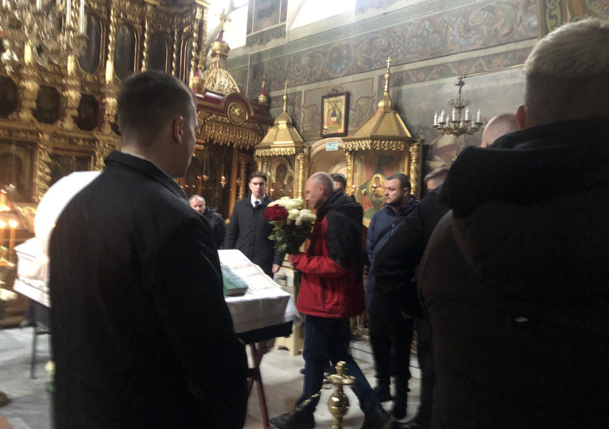 Тело покойного лежит в гробу белого цвета, в храме рядом с ним стоят плачущая мать, близкие, друзья и родственники. Трогательную речь произнес сын художника Никаса Сафронова Лука Затравкин, который дружил с музыкантом.
