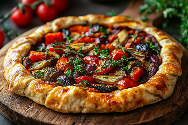Готовлю я так: сначала готовлю соус — томлю лук с чесноком в оливковом масле, добавляю сладкий перец, потом очищенные помидоры и травы, тушу 10 минут. Для теста смешиваю 200 граммов муки с 80 мл растительного масла, 80 мл воды и солью, раскатываю в круг. Тонко нарезаю цукини, баклажаны и помидоры, баклажаны предварительно запекаю. На тесто выкладываю остывший соус, сверху спиралью раскладываю овощи, посыпаю оливками, чесноком и травами. Заворачиваю края теста и выпекаю при 180 °C 35–45 минут до золотистого цвета. Подаю теплым — хрустящее тесто и нежные овощи создают потрясающий контраст.