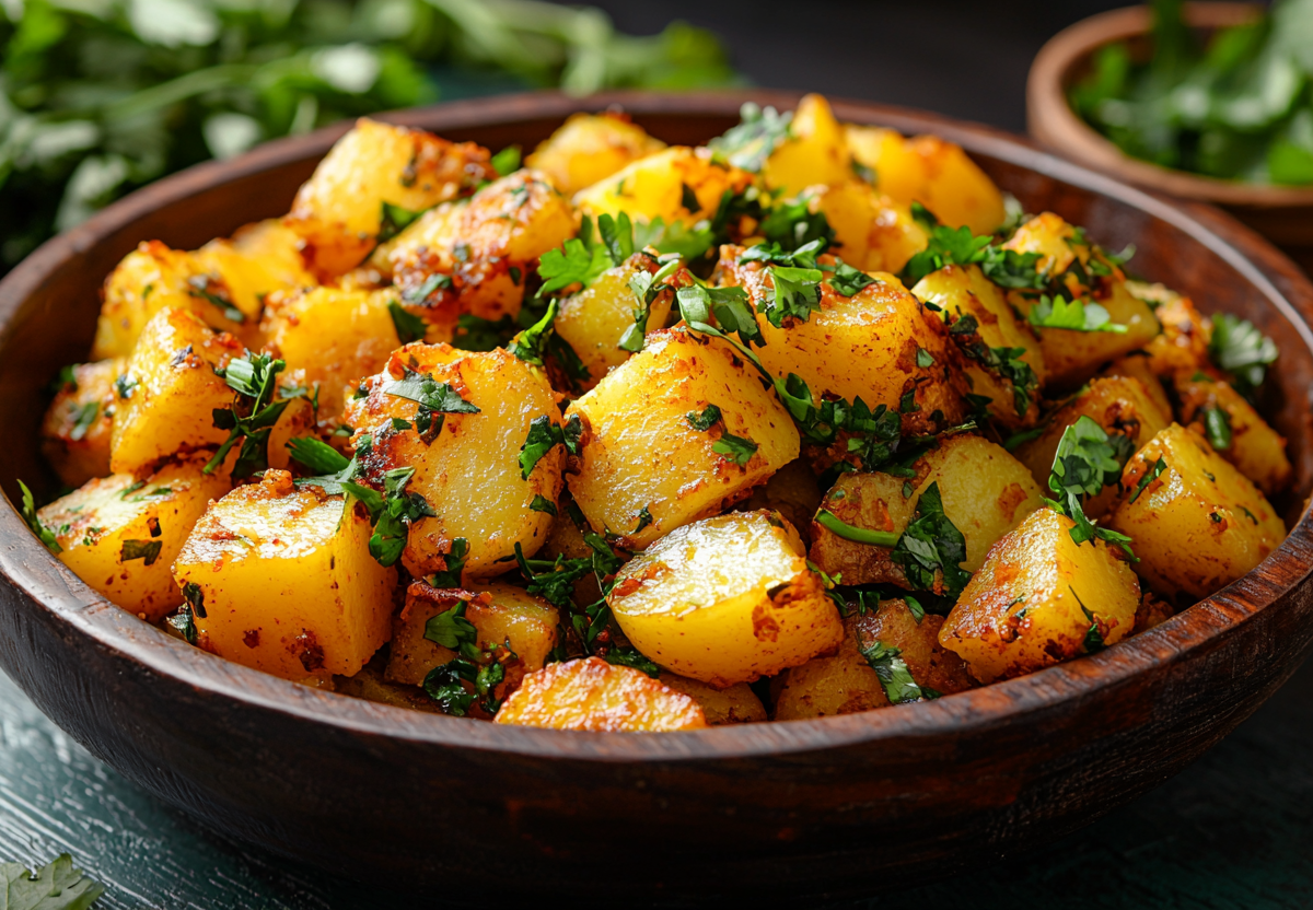 Готовлю я так: 400 граммов картофеля очищаю и нарезаю кубиками, 100 граммов сладкого перца — соломкой. В глубокой сковороде разогреваю растительное масло, добавляю половину чайной ложки асафетиды и щепотку смеси карри — томлю специи 30 секунд до аромата. Кладу картофель и обжариваю 5–7 минут, затем добавляю перец и 300 граммов кусочков ананаса. Солю, накрываю крышкой и тушу на среднем огне около 15 минут, пока картофель не станет мягким. В конце обильно посыпаю свежей кинзой. Подаю как самостоятельное блюдо или с рисом басмати — получается сытно, ароматно и необычно.