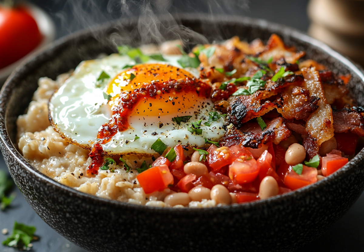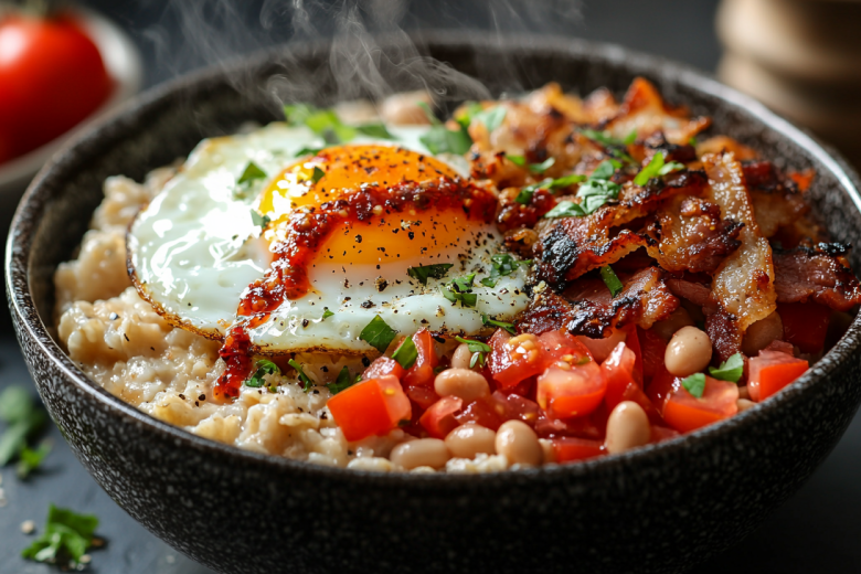 На сковороде готовят яичницу-глазунью или яйцо-пашот. В глубокую тарелку выкладывают горячую овсяную кашу, смешанную с творогом или рикоттой. Сверху добавляют фасоль в томатном соусе, яичницу и кусочки бекона. Блюдо украшают острым соусом шрирача и свежемолотым черным перцем. Такой завтрак прекрасно подходит для начала дня и обеспечивает длительное чувство сытости.