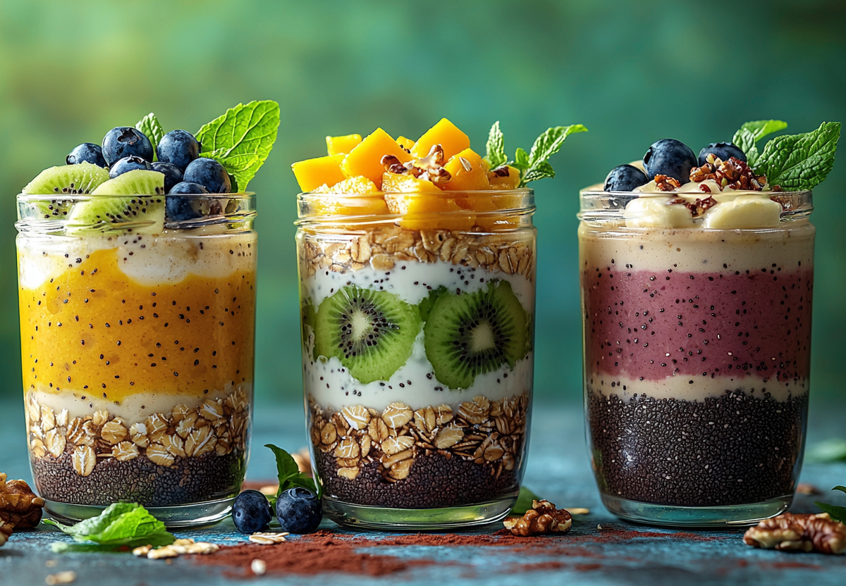 1. В прозрачную банку выложите слоями: овсянку → чиа → йогурт → молоко → мёд.