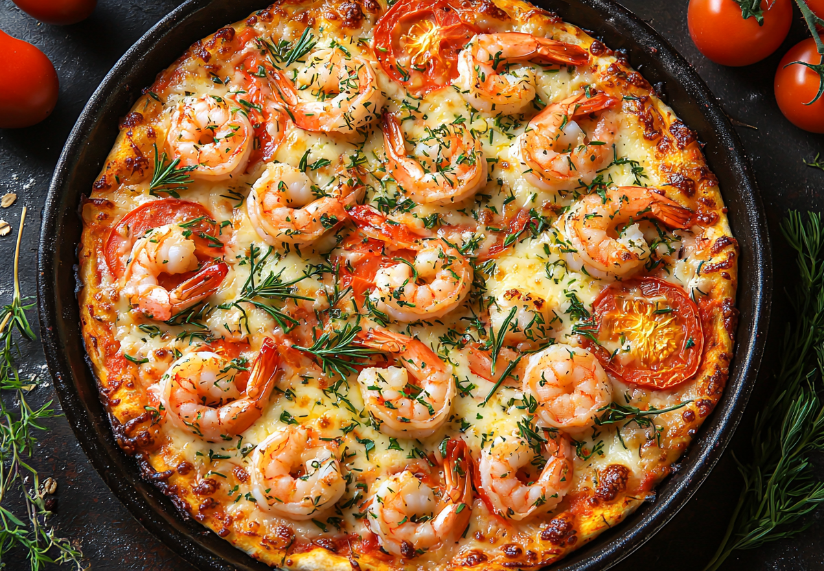 Для начинки и сборки: сразу на готовую сторону основы намазываю соус из смеси сметаны (2 ч. л.) и томатной пасты (2 ч. л.). Сверху выкладываю нарезанные помидоры (100 г), очищенные креветки (60 г) и кусочки моцареллы для пиццы (30 г). Посыпаю итальянскими травами.