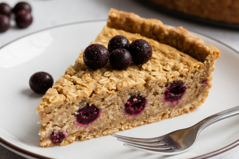 Для приготовления вам понадобится: 4 стакана овсяных хлопьев (измельчённых в блендере), ½ стакана растительного масла, ½ стакана крепкого чёрного чая (остывшего), 1 ч. л. разрыхлителя, ванилин, 100 г подсолнечной халвы, 1 стакан чёрной смородины, 50 мл фруктового сока без сахара. Смешайте измельчённые хлопья, разрыхлитель и ванилин. Влейте масло и чай, перемешайте до состояния влажной крошки. Халву раскрошите, смешайте со смородиной. В форму выложите половину крошки, утрамбуйте, добавьте начинку, прикройте оставшейся крошкой. Выпекайте при 180 °C 30 минут, затем полейте соком и пеките ещё 15–20 минут.