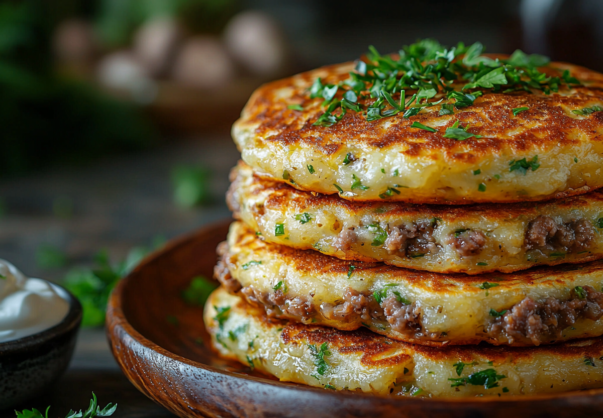 Приготовление: кефир слегка подогрейте до теплого состояния (около 30 °C). Добавьте в него соду, соль и сахар, перемешайте и оставьте на 15–20 минут для активации соды. Затем постепенно всыпайте просеянную муку, замешивая тесто до консистенции густой деревенской сметаны. В готовое тесто введите подготовленный мясной фарш и тщательно перемешайте до однородности. На хорошо разогретой сковороде с достаточным количеством растительного масла выкладывайте столовой ложкой порции теста, формируя округлые оладьи. Обжарьте с одной стороны до золотистой корочки на среднем огне, затем переверните, убавьте огонь, накройте крышкой и доведите до готовности еще 5–7 минут. Подавайте горячими.