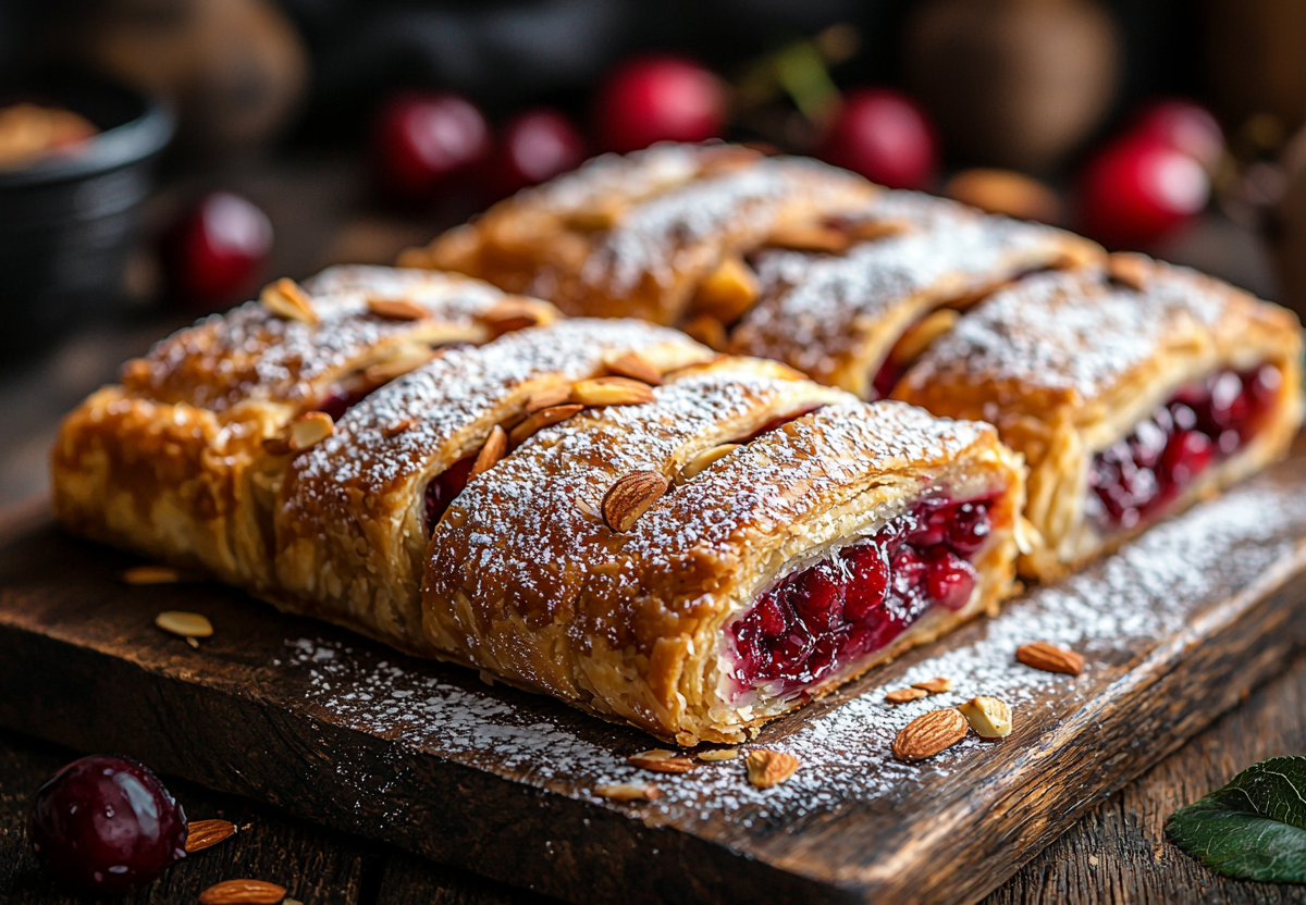 Замороженную вишню не размораживаю полностью — слегка оттаявшие ягоды лучше держат форму. Смешиваю вишню с сахаром и кукурузным крахмалом. Крахмал нужен, чтобы сок от ягод не вытек и не подгорел. Слоеное тесто раскатываю в пласт толщиной около 4 мм и нарезаю на квадраты или круги. На каждую заготовку выкладываю вишневую начинку (примерно 1 ст. л.). Края теста защипываю, формируя аккуратные пирожки. Выкладываю их на противень с пергаментом. Желток взбиваю с чайной ложкой воды и смазываю им пирожки — это даст красивый золотистый цвет. Сверху посыпаю миндальными лепестками. Выпекаю в разогретой до 180 °C духовке 20–25 минут до румяного оттенка. Даю пирожкам немного остыть на решетке и перед подачей обильно посыпаю сахарной пудрой через ситечко.