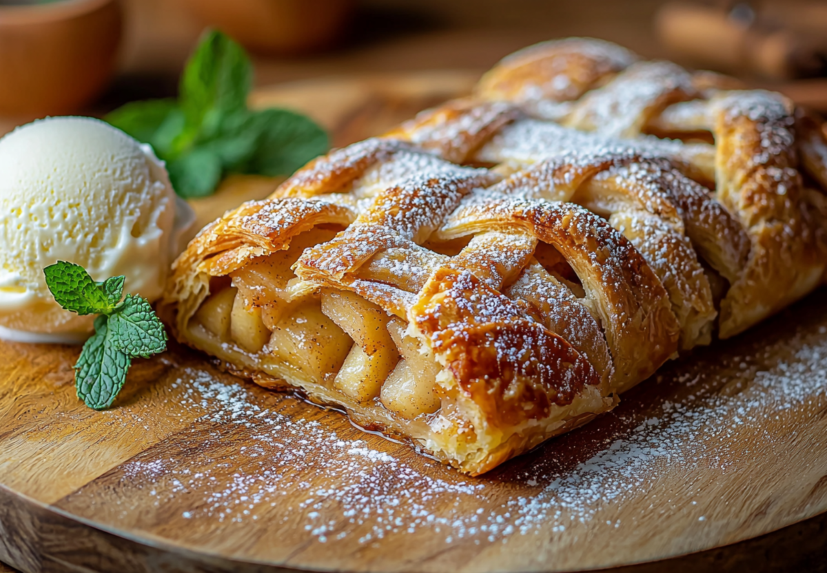 Очистите и нарежьте кубиками 3 яблока, обжарьте их на 30 граммах сливочного масла до мягкости. Добавьте 2 столовые ложки сахара и столовую ложку корицы — готовьте до карамелизации. Раскатайте пласт бездрожжевого слоеного теста, выложите начинку посередине. Сделайте надрезы по краям и заплетите их в виде косички, аккуратно закрывая начинку. Смажьте поверхность желтком, посыпьте сахаром и выпекайте при 180–190 °C 25–30 минут до золотистого цвета. Подавайте теплым с шариком ванильного мороженого, украсив мятой и сахарной пудрой, — это сочетание хрустящего теста и нежной начинки покорит любого!