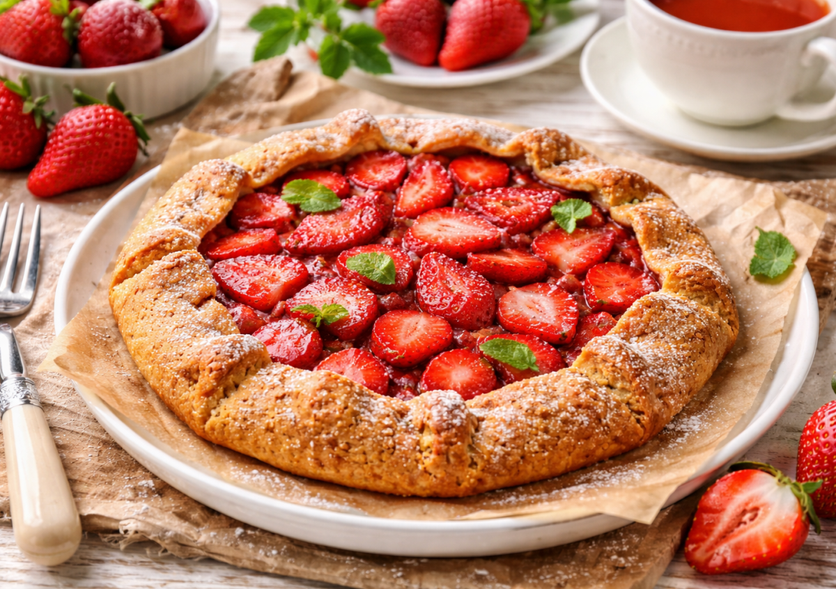 Как готовить: творог разомните вилкой до однородности. Добавьте яйцо, рисовую муку и 1 мерную ложку подсластителя, замесите мягкое тесто — оно может слегка липнуть, это нормально. Переложите тесто на лист пергамента и аккуратно сформируйте круглую лепешку толщиной около 0,5 см, присыпьте ее крахмалом. Клубнику нарежьте ломтиками, смешайте с оставшимся подсластителем и выложите в центр, оставляя по краям примерно 3 см свободного теста. Края заверните внутрь, формируя открытую галету. Выпекайте в духовке, разогретой до 200 °C, 20–25 минут до легкой румяной корочки. Дайте немного остыть — и можно подавать.