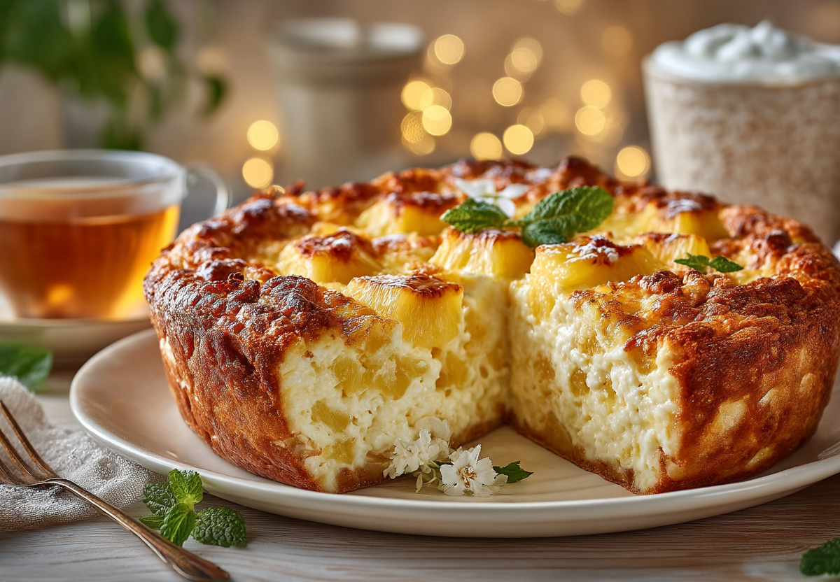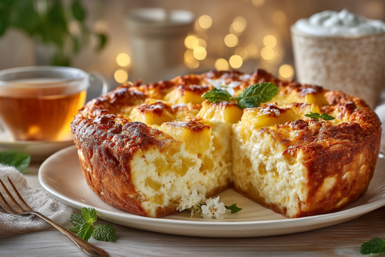 Получается потрясающе вкусное блюдо: высокая, пышная запеканка с золотистой румяной шапкой и невероятно нежной, воздушной текстурой внутри. Она действительно тает во рту, как зефир, но при этом дает приятную сливочную сытость творога. Кусочки ананаса взрываются сочными сладкими нотками, напоминая о лете и солнце. Никакой приторности, только легкая фруктовая кислинка и ванильный аромат.