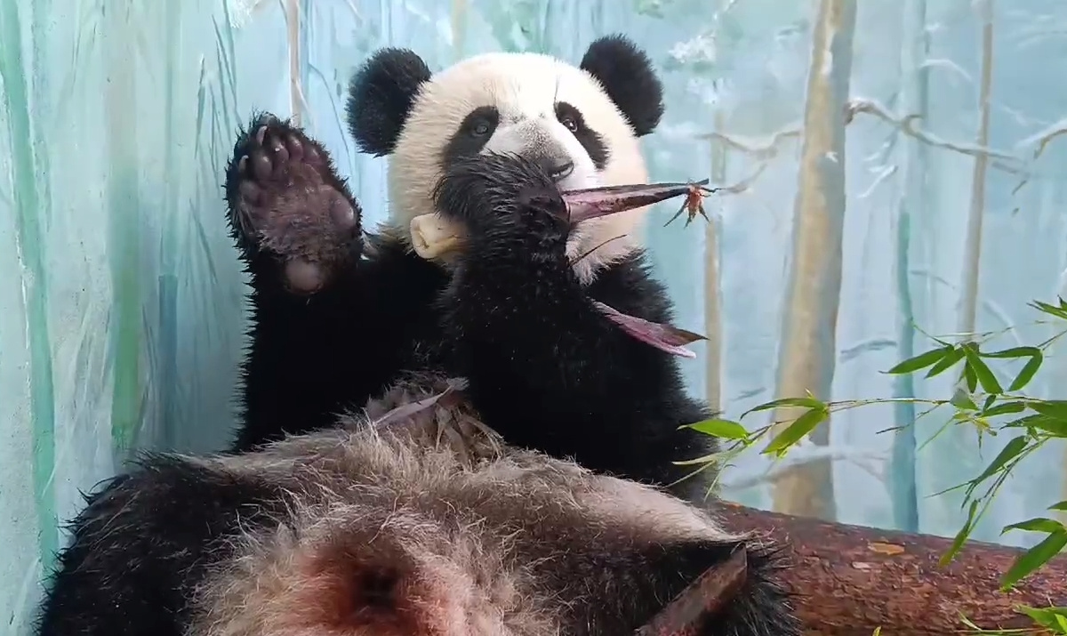 В ролике видно, как подросший медвежонок очищает небольшой росток бамбука, облокотившись на бревна. Катюша перебирала растение из одной лапы в другую и иногда держала его обеими, а когда смогла отломать росток, то принялась грызть его.