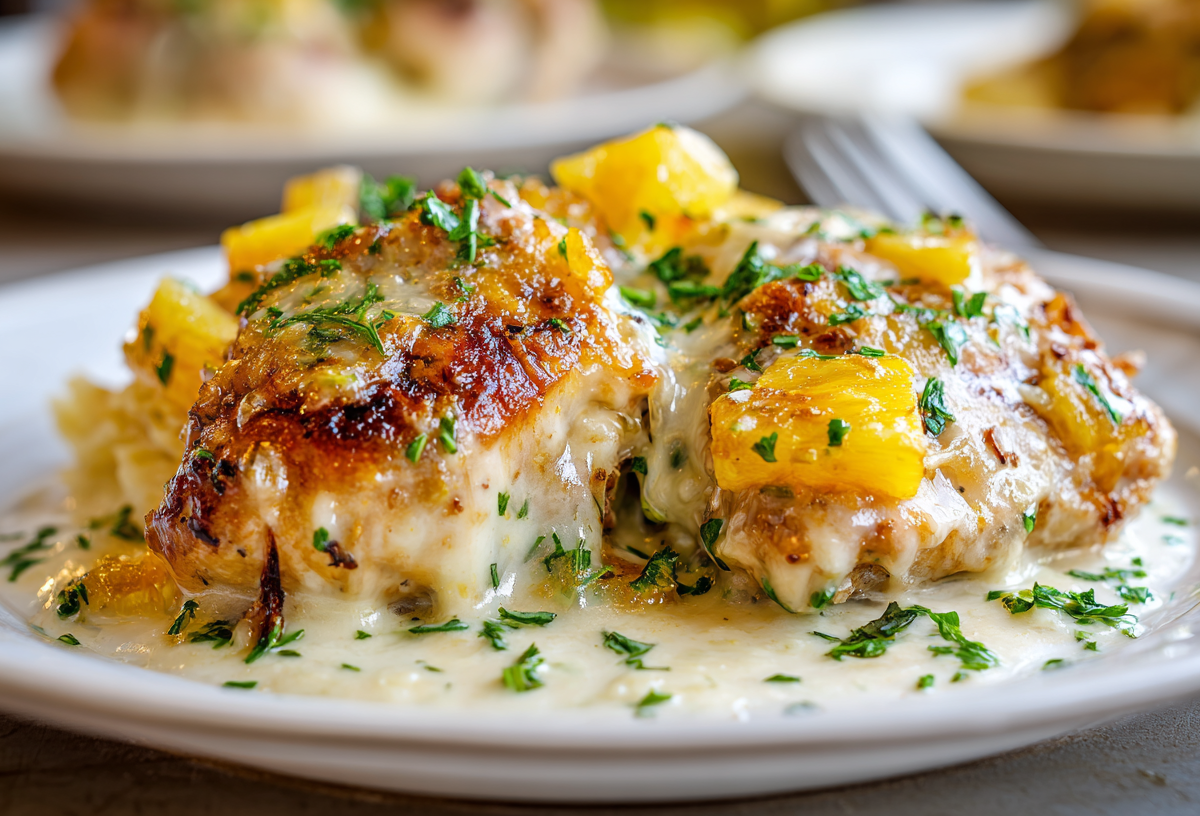 Это блюдо выглядит настолько эффектно, что его не стыдно подать гостям, а готовится оно практически без вашего участия. Сочетание нежной курицы, сладкого ананаса и расплавленного сыра покоряет с первого раза.
