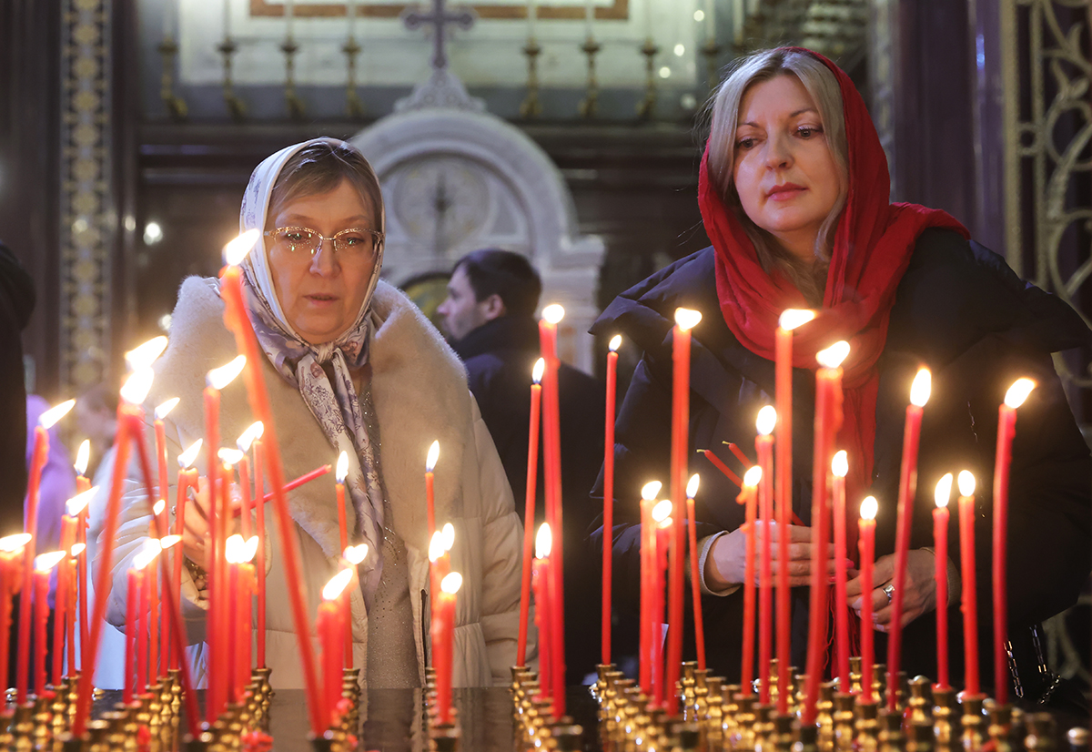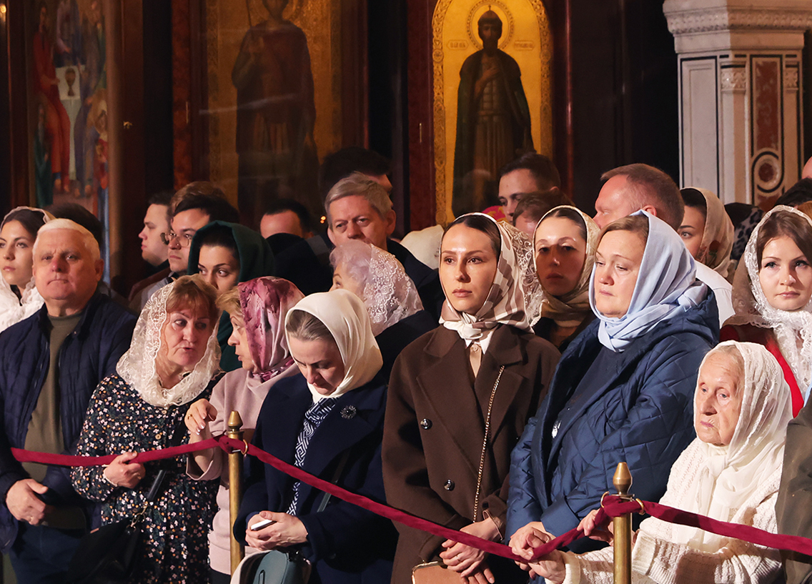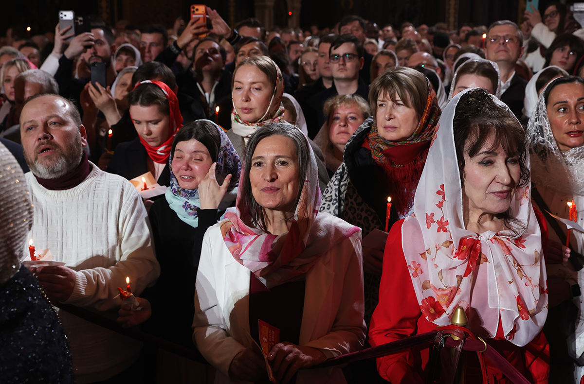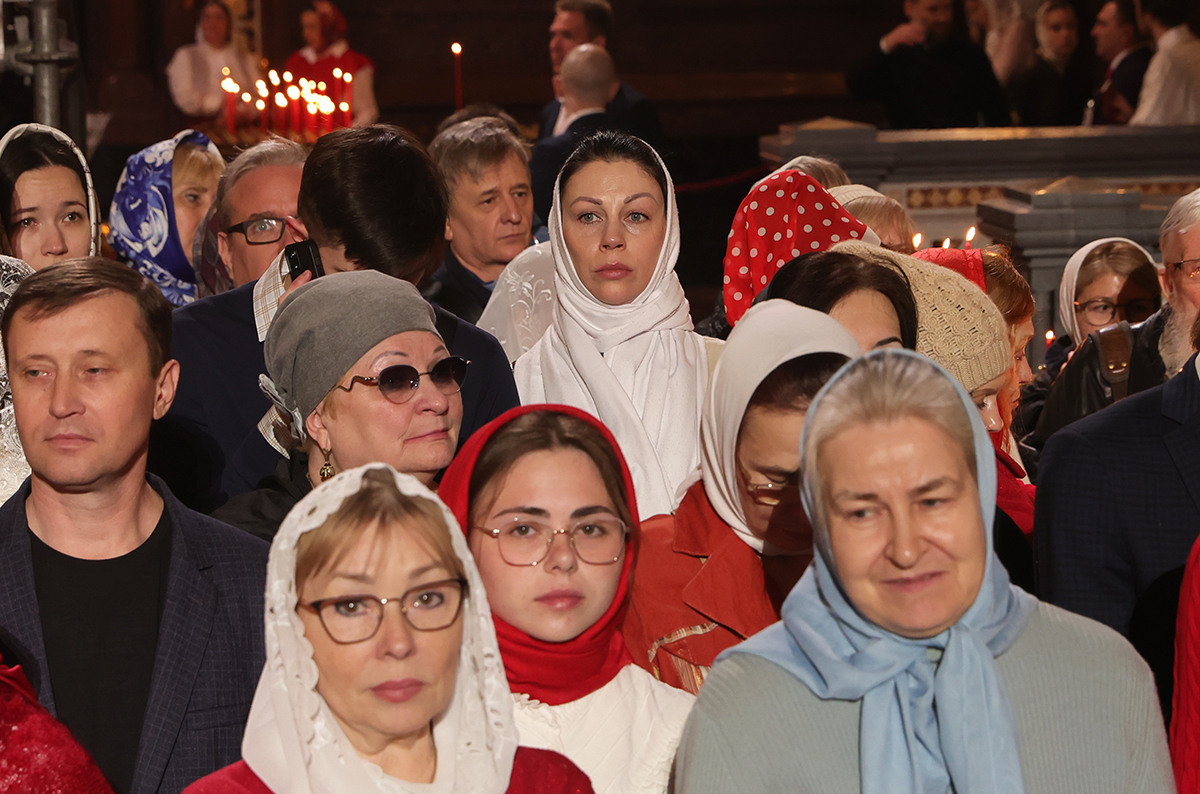 Прихожане в храме Христа Спасителя в Москве перед началом праздничного пасхального богослужения