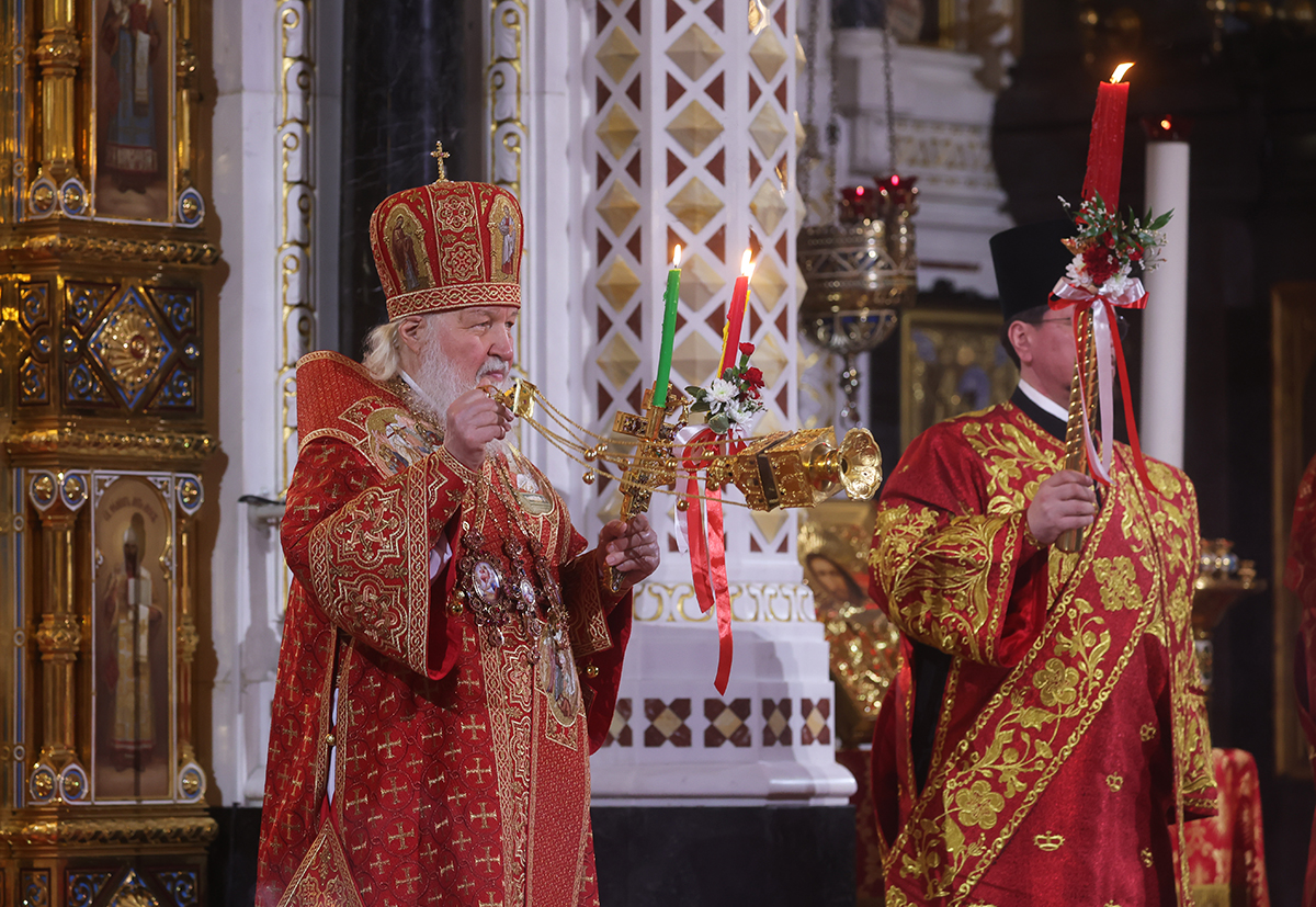 Службу возглавил патриарх Московский и всея Руси Кирилл. Он был облачен в торжественное белое одеяние — саккос и вместе с сонмом духовенства совершал праздничные песнопения. В руках верующих алели красные пасхальные свечи — символ Воскресения. Торжеству предшествовал крестный ход, который изображает путь жен-мироносиц, спешивших к Гробу Спасителя.