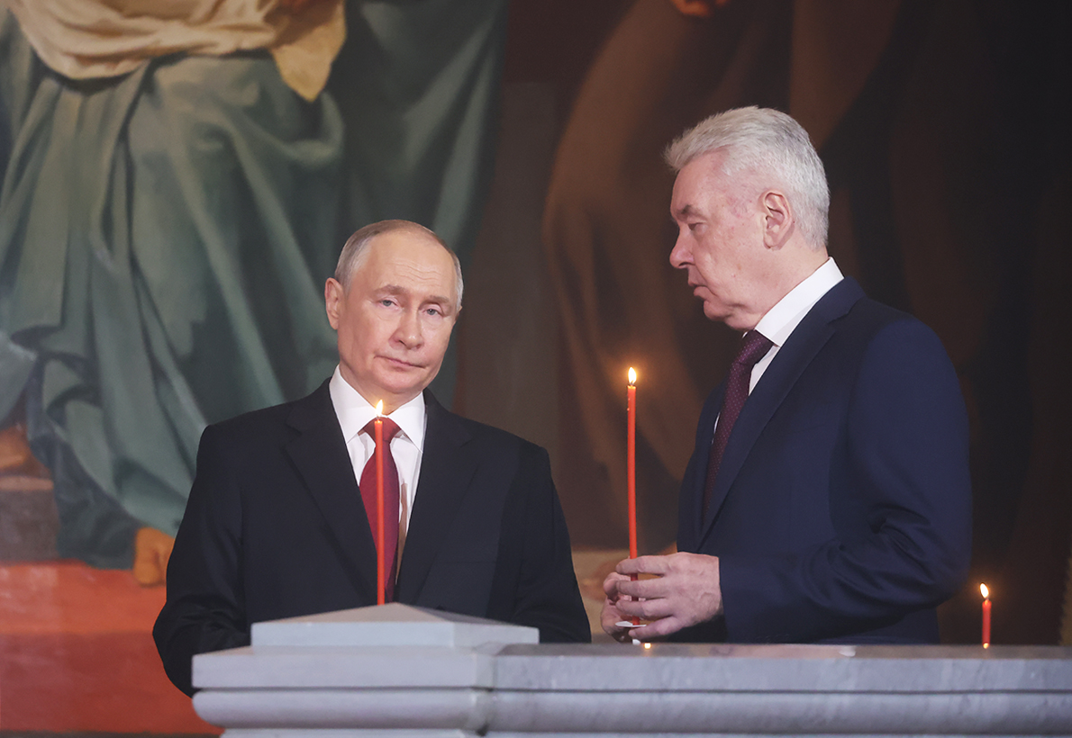 Президент РФ Владимир Путин и мэр Москвы Сергей Собянин на праздничном пасхальном богослужении в храме Христа Спасителя в Москве