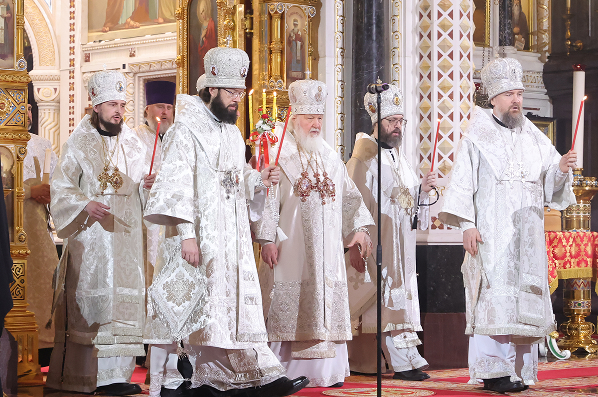 Патриарх Московский и всея Руси Кирилл на праздничном пасхальном богослужении в храме Христа Спасителя в Москве
