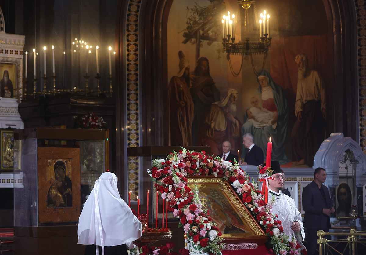 Владимирская и Донская иконы Божией матери в храме Христа Спасителя в Москве во время праздничного пасхального богослужения. Иконы были переданы Русской православной церкви из Третьяковской галереи