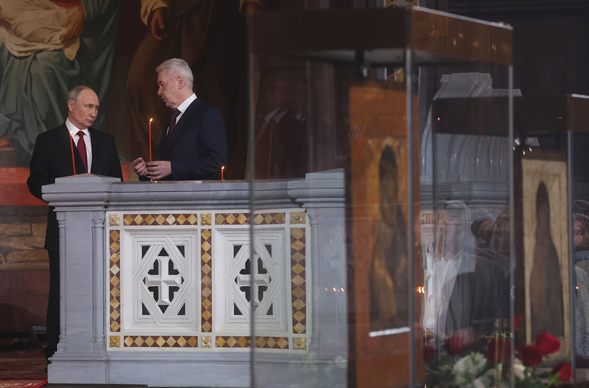 Президент РФ Владимир Путин и мэр Москвы Сергей Собянин (справа) на праздничном пасхальном богослужении в храме Христа Спасителя в Москве