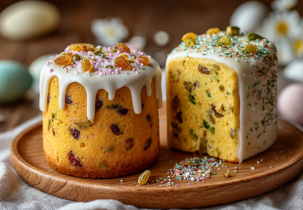 Разложите в формы на 1/3, дайте подняться до краев. Выпекайте при 170–180 °C 40–50 минут. Для глазури взбейте белки с сахарной пудрой и лимонным соком до крепких пиков. Украсьте остывшие куличи.