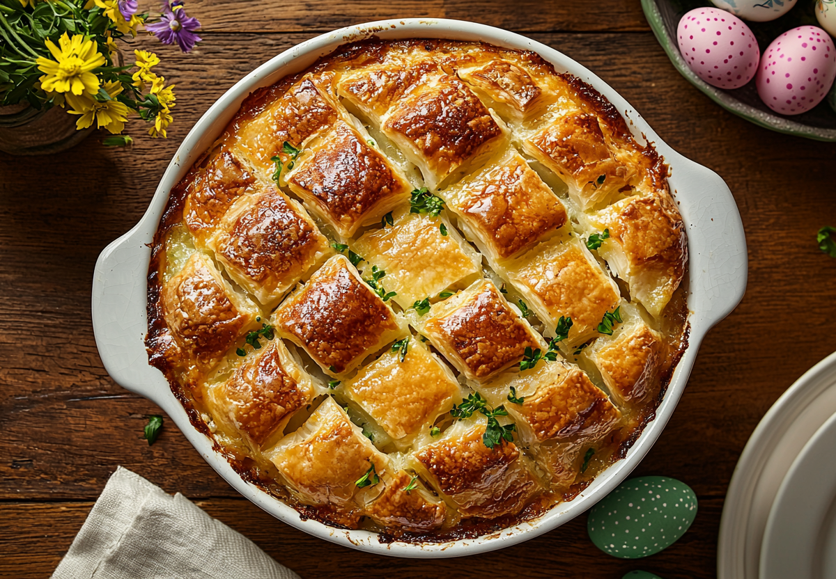 Подавайте теплым — пирог получается сочным, с нежной рыбой и тающим картофелем. Отличная альтернатива традиционным пасхальным блюдам!