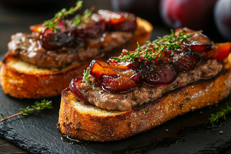 Подача: багет нарезаю ломтиками, сбрызгиваю оливковым маслом и подрумяниваю в духовке при 200 °C 5 минут. На каждый тост намазываю паштет, сверху выкладываю по ложечке медового лука и пару долек карамельной сливы.