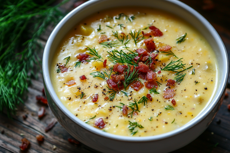 Такой суп покоряет своей совершенной текстурой: он густой, шелковистый и очень нежный. В каждой ложке — гармония трех ключевых вкусов: сладость печеного картофеля, солоноватая дымность бекона и пикантная глубина плавленого чеддера.