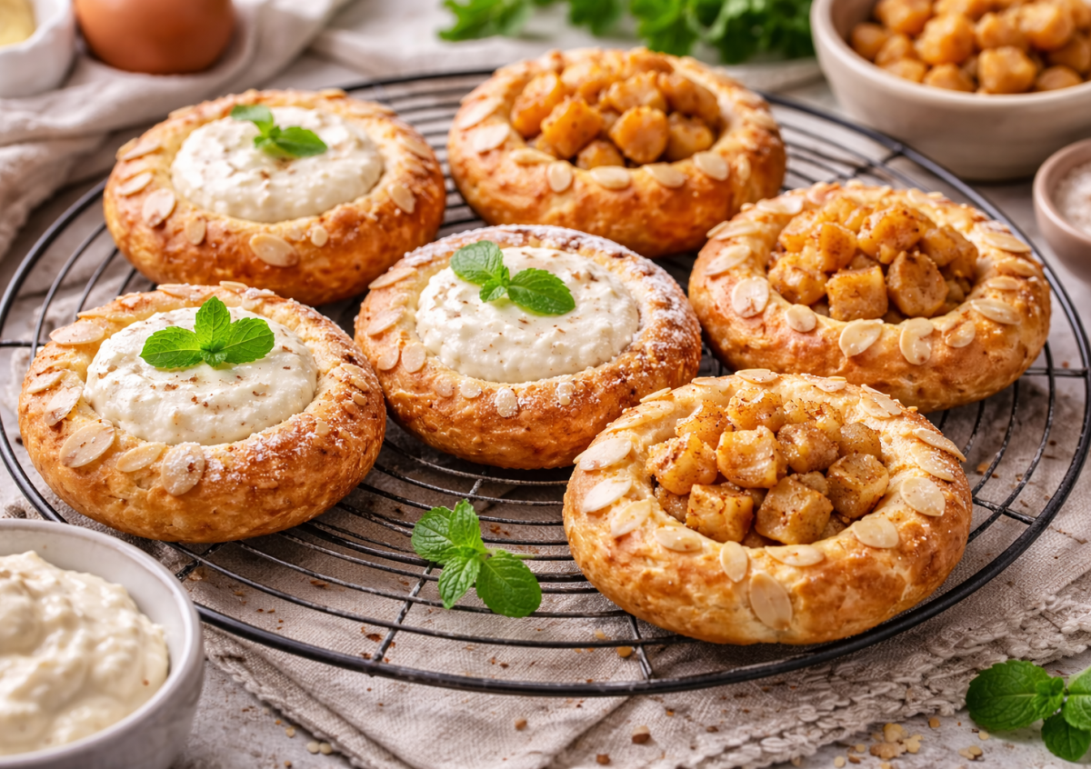 Для начинки подойдет мягкий творог с подсластителем — получается нежно и сливочно. Второй вариант — яблоки с корицей: нарезать кубиками и немного потушить на сливочном масле около 5 минут.