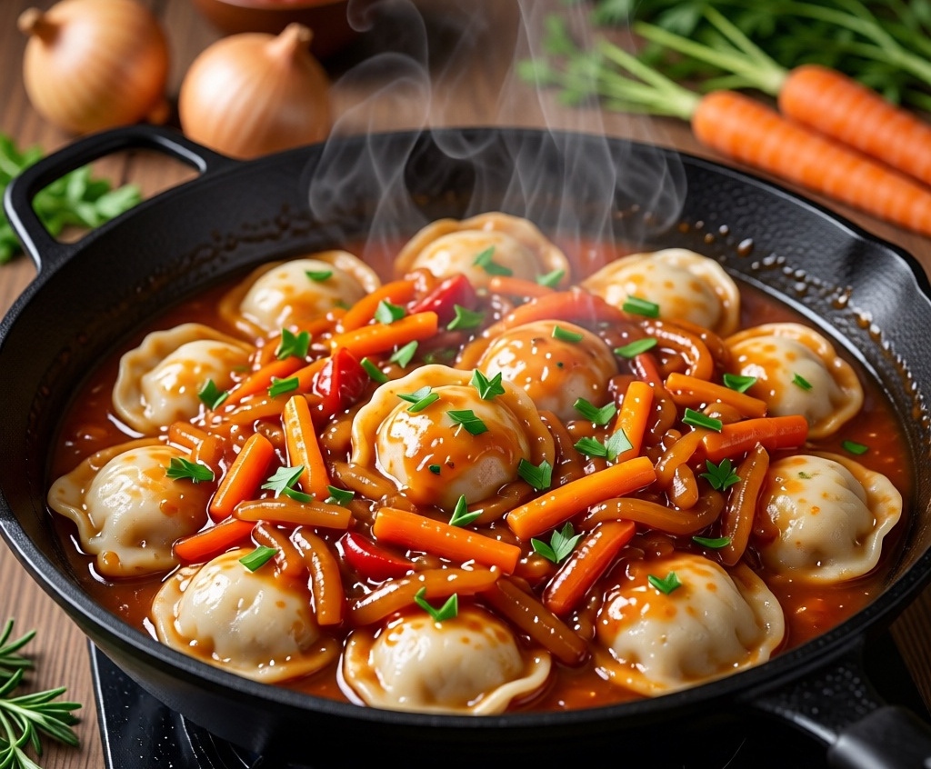 Эти тушеные пельмени в овощном соусе — гениально простое и невероятно вкусное открытие, которое переворачивает привычное представление о полуфабрикатах. Их необычность в том, что вместо скучной варки в воде замороженные пельмени томятся в ароматной подливе из лука, моркови и томата, впитывая в себя все соки и превращая даже самый бюджетный ужин в ресторанное блюдо. Получается обалденная вкуснятина: сочные, пропитанные овощным соусом пельмени с нежнейшей начинкой, окруженные густой, бархатистой подливой с карамельным луком и сладковатой морковью. Каждый кусочек тает во рту, оставляя насыщенное томатное послевкусие с пряным чесночным акцентом.