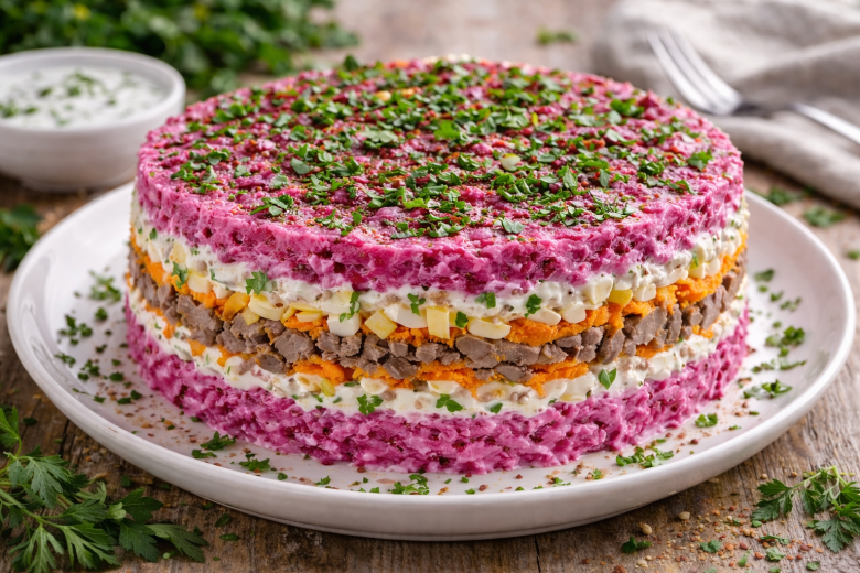 Этот салат — настоящая находка для тех, кто любит не только вкусно, но и полезно. Свекла, печень, яйца и овощи делают его насыщенным витаминами, сытным и очень гармоничным по вкусу. Несмотря на простые ингредиенты, результат всегда удивляет — нежный, сочный и с изюминкой. На праздничном столе он исчезает одним из первых, а гости каждый раз спрашивают рецепт.