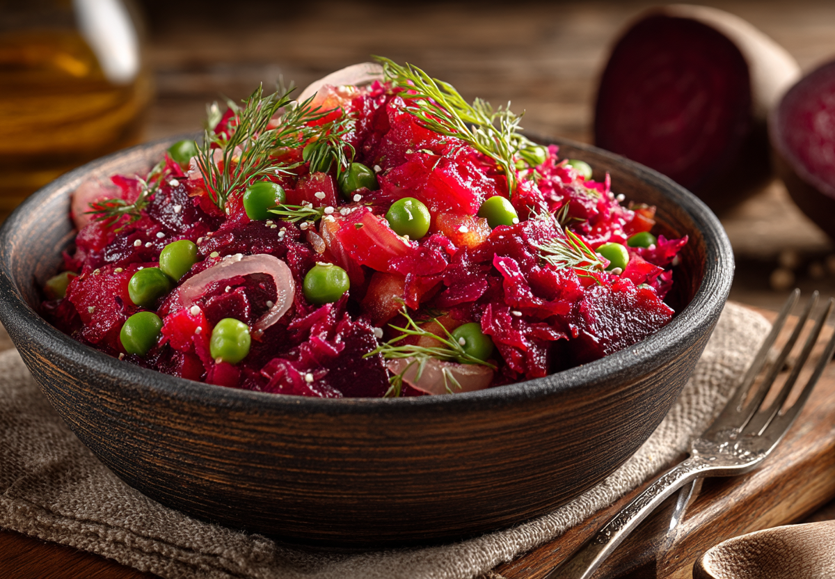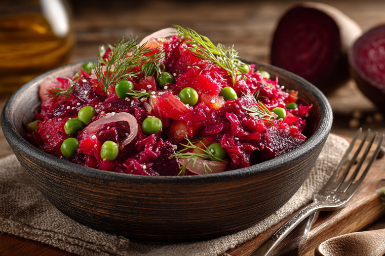 Этот простой, но невероятно вкусный салат из четырех ингредиентов заставит вас забыть о скучном винегрете. Сладковатая вареная свекла, карамелизованный лук, нежный горошек — сочетание на миллион.