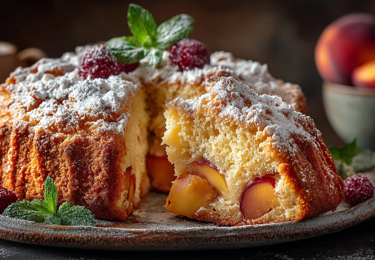 Духовку разогреваю до 180°C. Форму диаметром 22 см смазываю растительным маслом, дно застилаю пергаментом, а стенки присыпаю тонким слоем муки. В глубокой миске миксером на высокой скорости взбиваю 5 яиц со 150 г сахара в очень пышную, светлую, почти белую массу — это займёт около 5-7 минут. 240 г муки смешиваю с 1,5 чайными ложками разрыхлителя и просеиваю через сито. Аккуратно, порциями, лопаткой вмешиваю мучную смесь в яичную массу движениями снизу вверх, стараясь сохранить воздушность. 450 г персиков (можно взять консервированные, но свежие лучше) нарезаю небольшими кусочками, удаляя косточки. Выкладываю персики на дно подготовленной формы ровным слоем. Заливаю сверху тестом и аккуратно разравниваю лопаткой. Выпекаю в разогретой духовке около 35-40 минут до глубокого золотистого цвета. Готовность проверяю деревянной зубочисткой — она должна выходить сухой. Даю пирогу немного остыть в форме, затем переворачиваю на блюдо, снимаю пергамент и подаю.