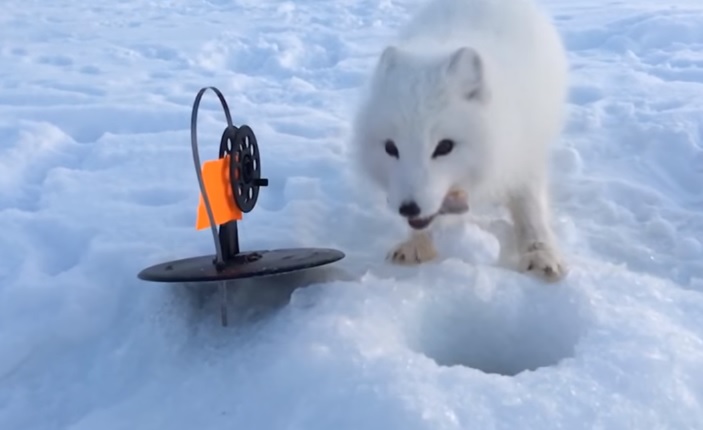 Месяц назад пользователей Сети покорил наглый белый песец, который приворовывал улов у автора ролика — Ильдара Биктимирова — прямо из лунки во время зимней рыбалки. Тогда рыбак отгонял дикое животное фразами: «Лунка моя, рыба моя».