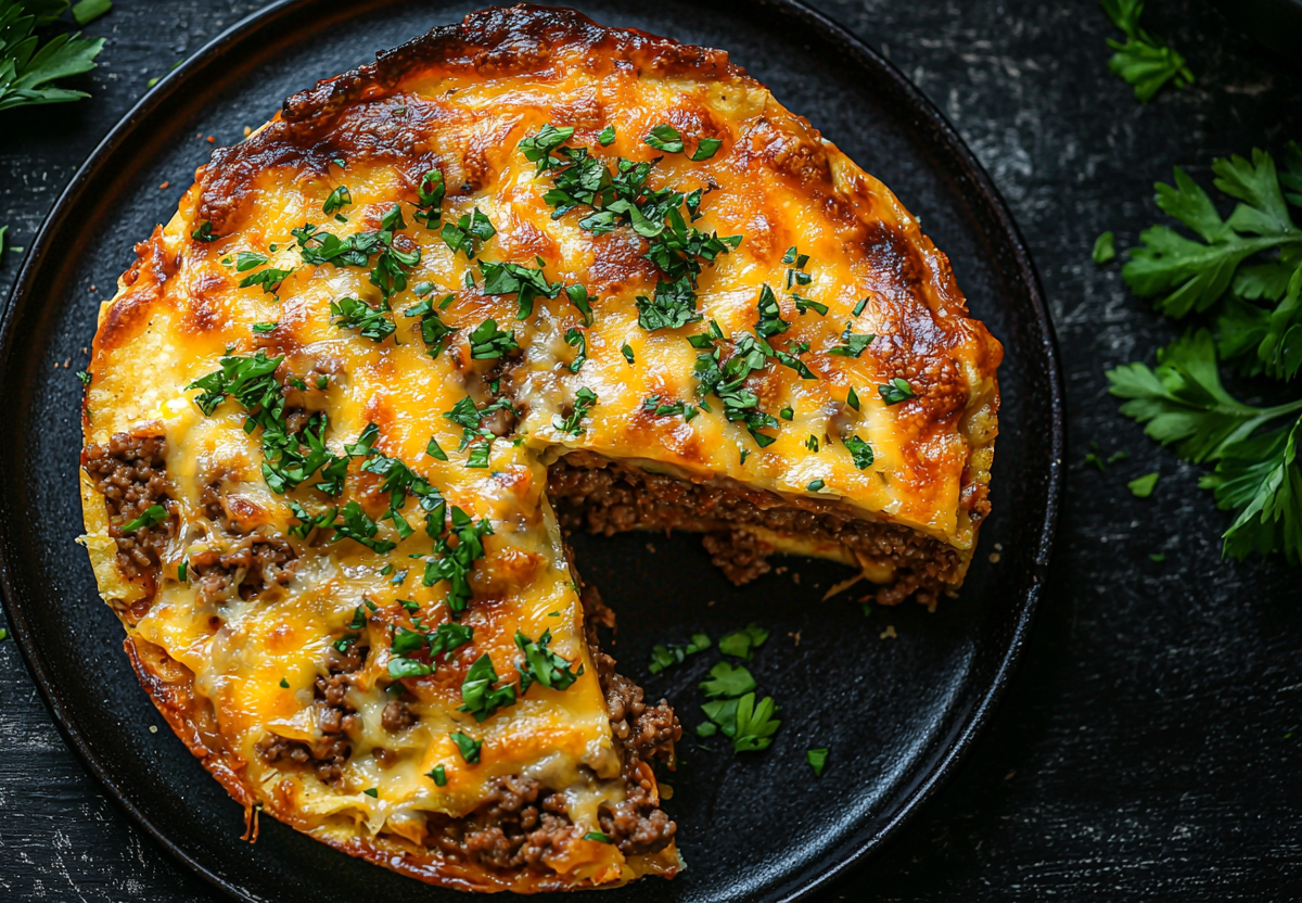 Даю пирогу немного остыть в форме (5–7 минут), затем аккуратно нарезаю на порции, как пиццу. Подаю горячим.
