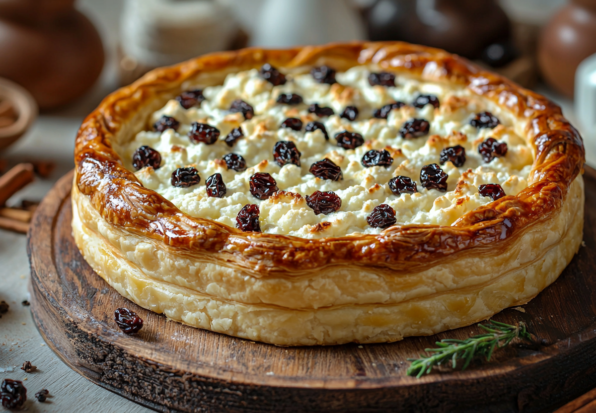 Рецепт: раскатайте 500 г готового слоеного теста, выложите на противень. Для начинки смешайте 400 г творога, 2 яйца, 5 ст. л. сахара, щепотку ванилина и горсть изюма. Равномерно распределите начинку по тесту, заверните края и выпекайте 25–30 минут при 180 °C до золотистого цвета.