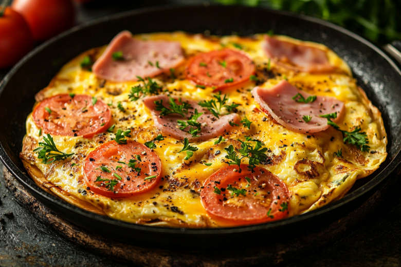 Для приготовления понадобится: 2-3 листа тонкого лаваша, 3 яйца, 50 мл молока, 150 г ветчины или вареной колбасы, 1-2 средних помидора, 200 г твердого сыра, соль, черный перец. В миске взбейте яйца с молоком, солью и перцем. Ветчину нарежьте тонкой соломкой, помидоры — кружочками, сыр натрите на терке. Разогрейте сковороду, смажьте маслом. Вылейте примерно половину яичной смеси и накройте ее одним листом лаваша. На лаваш выложите ветчину и часть сыра. Накройте вторым листом лаваша. На него выложите помидоры и еще часть сыра. Накройте третьим листом лаваша. Аккуратно залейте оставшуюся яичную смесь сверху. Посыпьте оставшимся сыром. Накройте сковороду крышкой, убавьте огонь до минимума и готовьте 7-10 минут, пока яйца полностью не схватятся, а сыр не расплавится.