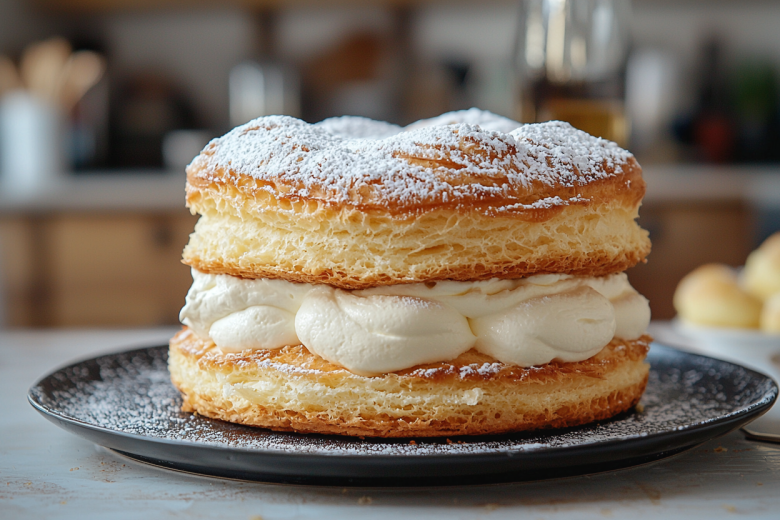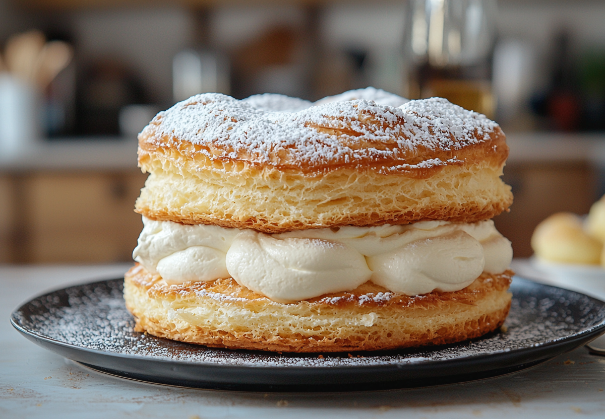 Рецепт: для коржей влейте в кастрюлю 500 мл воды, добавьте 200 г сливочного масла, щепотку соли и доведите до кипения. Всыпьте 300 г муки и интенсивно перемешивайте 2–3 минуты до образования шара. Охладив массу, вбивайте по одному 5 яиц до состояния гладкого теста. Разделите его на две части, выпекайте каждую на противне при 200°C 25–30 минут до золотистого цвета. Для крема в 500 мл холодного молока добавьте 100 г сахара, 2 яйца, 80 г муки и 1 пакетик ванилина. Варите на медленном огне до загустения, затем взбейте с 100 г размягченного сливочного масла. Один корж оставьте в форме, вылейте на него крем, накройте вторым коржом сверху и отправьте в холодильник стабилизироваться.
