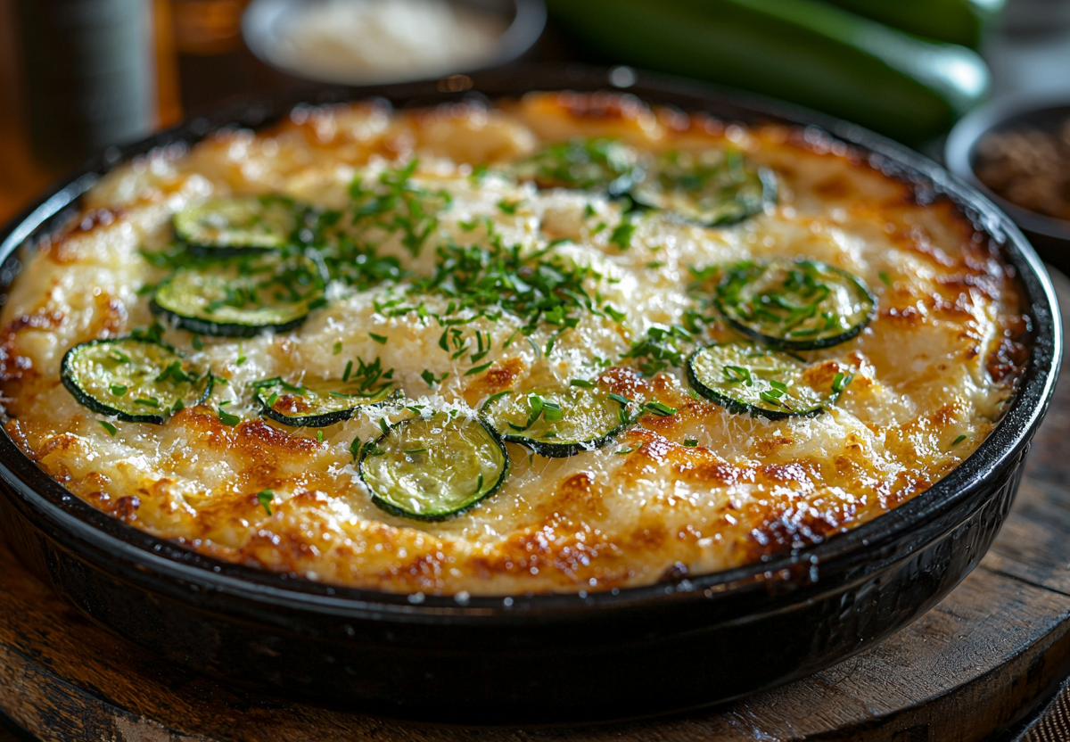 3. Выпечка. Вылейте массу в форму, сверху разложите тонкие ломтики кабачка. Посыпьте оставшимся сыром. Выпекайте 35–40 минут при 200 °C. Готовность: золотистая корочка и сухая зубочистка.