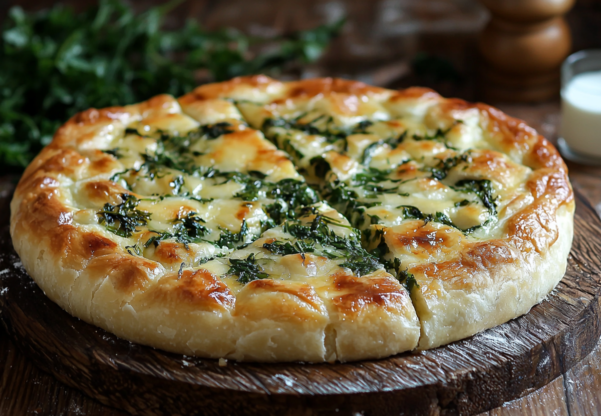 Для начала приготовим тесто. Просей 500 г муки в миску, добавь 1 ч. л. соли, 250 мл теплой воды и 50 мл кефира. Введи 7 г сухих дрожжей и замешивай, пока тесто не станет эластичным и не липким. Добавь 1 ст. л. растительного масла, вымеси, накрой и оставь в тепле на 1–1,5 часа. Для начинки 400 г осетинского сыра (или смеси брынзы и адыгейского) разомни вилкой. 500 г свежего шпината или смеси зелени (мангольд, кинза, петрушка) мелко нарежь, можно слегка обдать кипятком и отжать. Смешай зелень с сыром, добавь соль и перец по вкусу. Подошедшее тесто раздели на две части (одна чуть больше). Большую раскатай в круг, выложи начинку, накрой второй лепешкой и плотно защипи края. Выпекай в разогретой до 200 °C духовке 25–30 минут до золотистого цвета. Сразу после смажь топленым маслом.