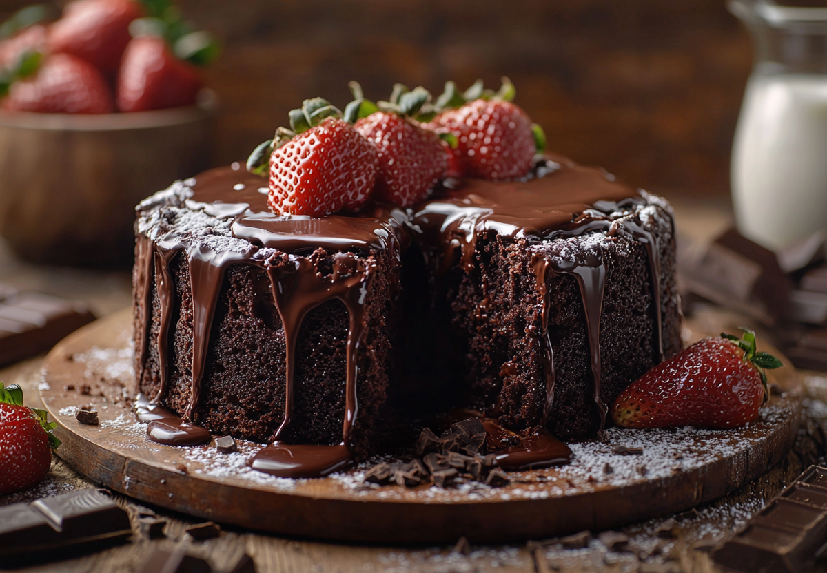 4. Вылейте в смазанную форму и выпекайте 30 минут при 180 °C. Остудите немного, украсьте шоколадной пастой и клубникой.