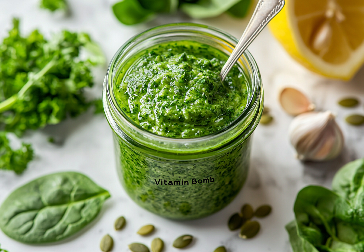 Этот зеленый соус стал моим фаворитом — теперь я подаю его ко всем салатам, мясу и даже просто намазываю на хлеб. И знаете что? Он не только безумно вкусный, но и невероятно полезный для здоровья, красоты и вашей кожи! Этот чудо-соус — настоящая витаминная кладовая. В нем столько полезных веществ, что просто диву даешься! Шпинатная основа в сочетании с ароматной зеленью, полезными тыквенными семечками и оливковым маслом создает неповторимый вкус и дарит заряд энергии на весь день.