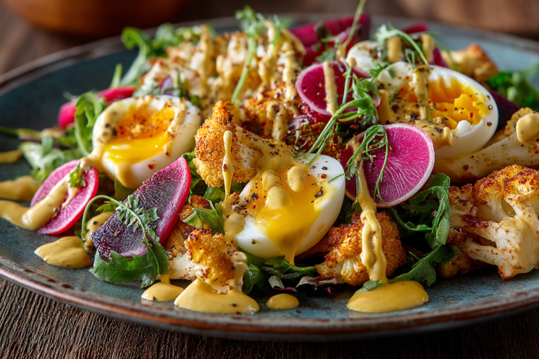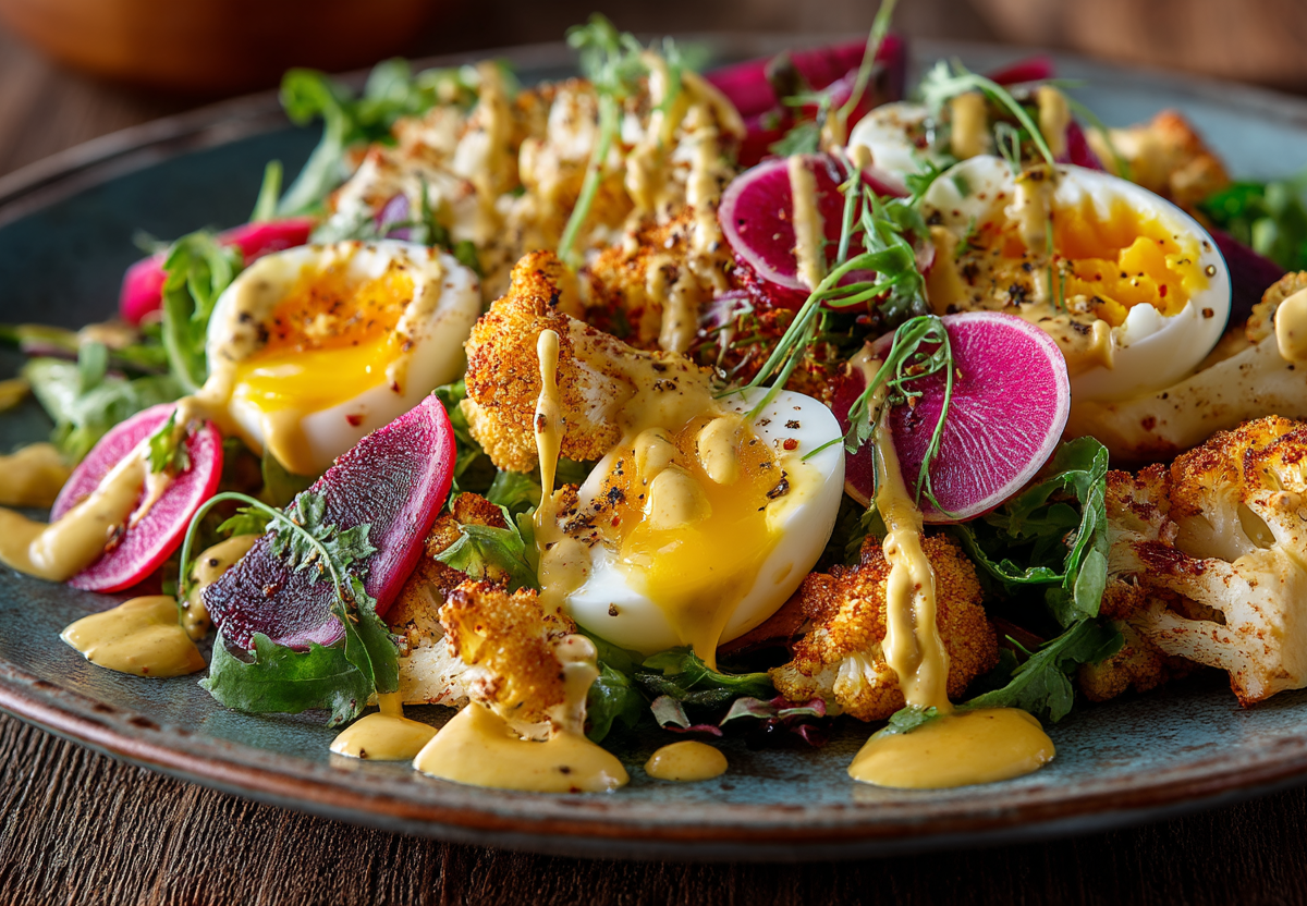 В просторной миске соединяем соцветия капусты, ломтики ревеня и нарезанные яйца. Поливаем подготовленной заправкой, аккуратно перемешиваем и даем салату настояться в холодильнике 10–15 минут для раскрытия вкусов перед подачей.