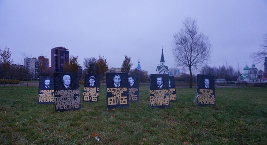 «Похороны» были проведены к годовщине Октябрьской революции. На «надгробиях» изображены Сергей Боярский, Сергей Вострецов, Игорь Дивинский, Владимир Катенев, Евгений Марченко, Виталий Милонов, Юрий Петров, Михаил Романов, сообщается в группе «Петербург против» во «ВКонтакте».