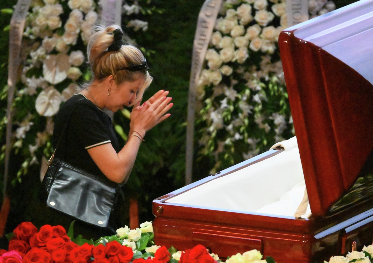 10:00 Церемония прощания началась. Открытый гроб с телом Маслякова стоит на сцене в окружении венков и цветов. На экранах транслируют моменты из его жизни. У гроба с телом ведущего сидит его безутешная семья — супруга Светлана Маслякова и сын Александр Масляков — младший, а также его невестка и внучка.