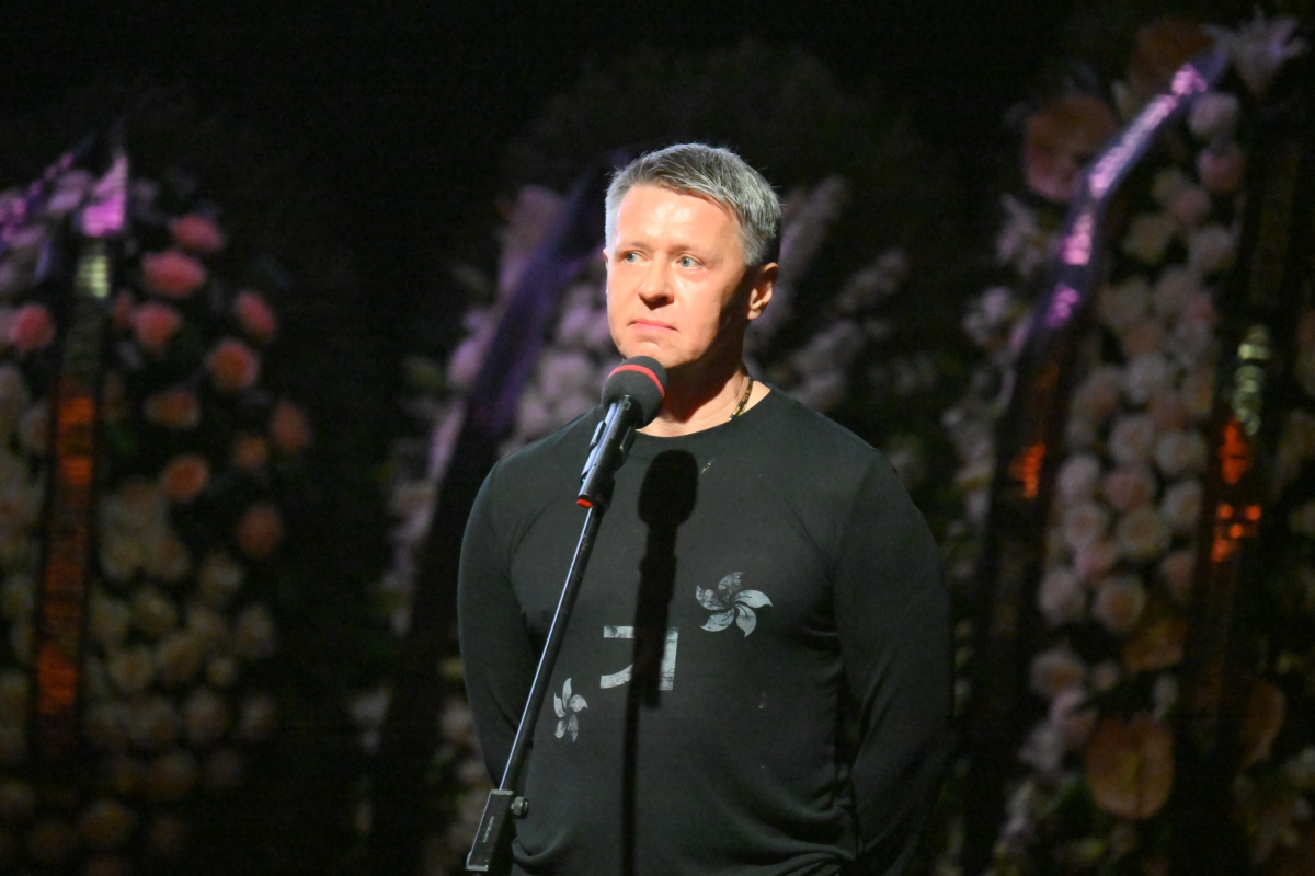 Актер Виктор Васильев на церемонии прощания с телеведущим Александром Масляковым во время гражданской панихиды в «Планете КВН»