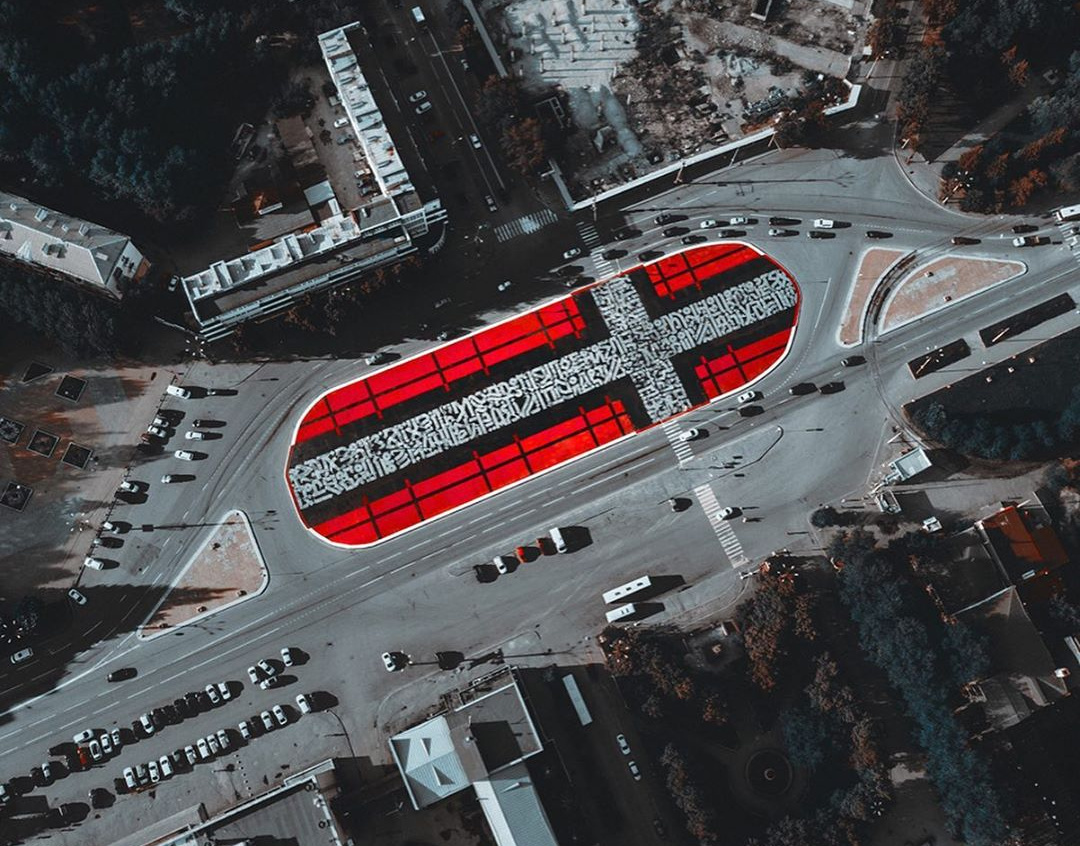 Крест из фрагментов манифеста Казимира Малевича, как писал News.ru, Покрас Лампас с помощью волонтёров нарисовал на площади более шести тысяч квадратных метров во время фестиваля уличного искусства «Стенограффия». Однако картина долго не продержалась: уже через несколько дней дорожные рабочие начали укладывать поверх неё асфальт.