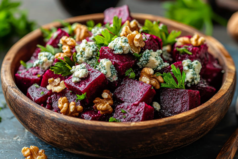 Основа: свекла — 2 корнеплода, сыр горгонзола — 40–50 граммов, ядро грецкого ореха — 2 столовые ложки, мед цветочный — 2 чайные ложки, чеснок молодой — 1 долька, тимьян свежий — 3 веточки, масло сливочное — 20 граммов, соль, перец, мускат — по щепотке. Для цитрусового крема: сметана деревенская — 3 столовые ложки, апельсин — цедра (1/2 ч. л.) и фреш (1 ст. л.).