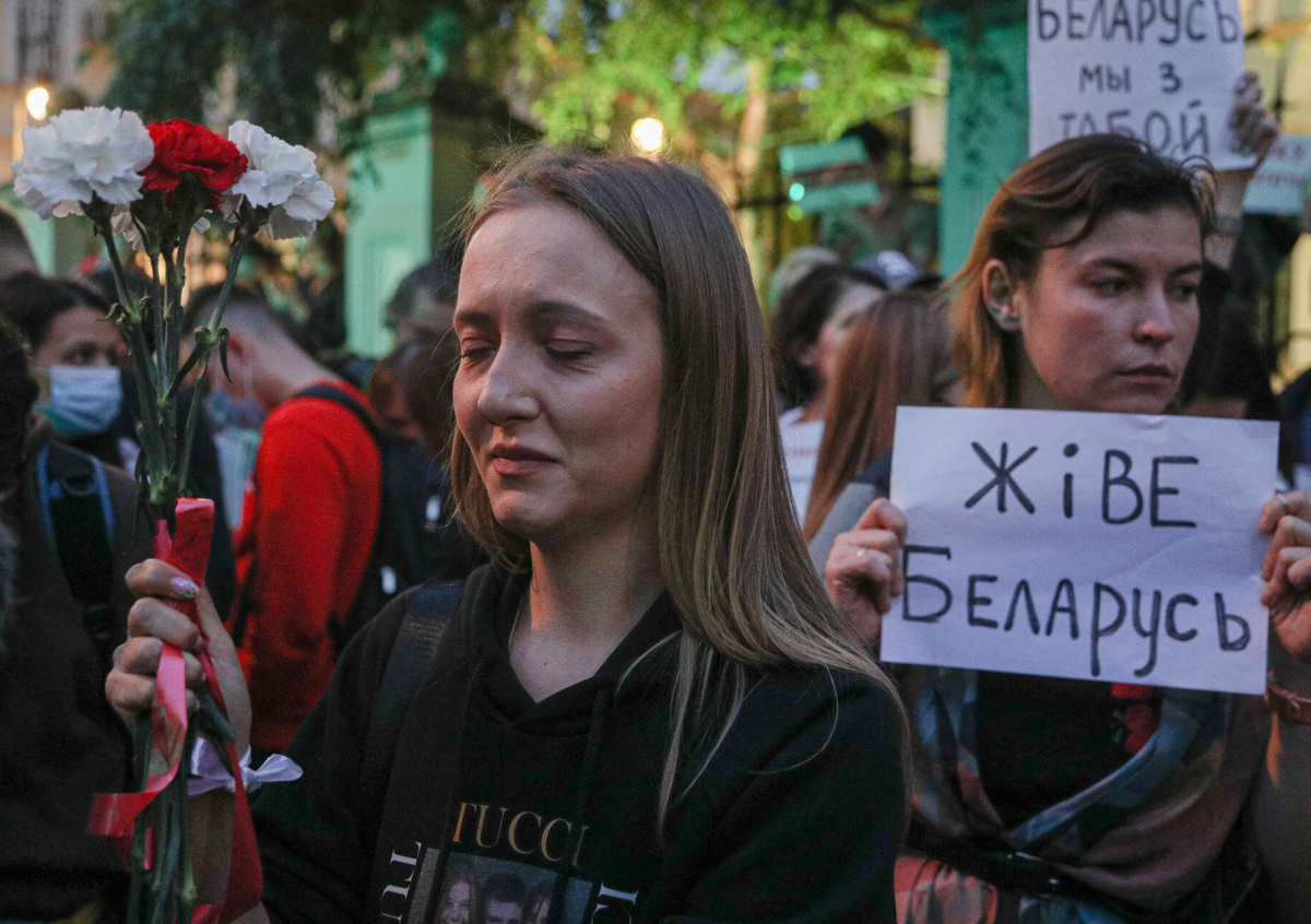 Задержали женщину, которая спросила полицейских, что происходит, когда они стали проверять документы у двух людей с бело-красно-белыми флагами, — говорится в публикации, которая обновилась в 16:55.