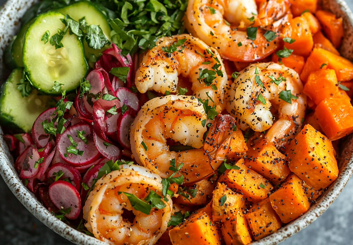 Батат-боул представляет собой сбалансированное и питательное блюдо, которое сочетает сладость батата и свежесть овощей. Этот обеденный вариант отличается простотой приготовления и насыщенным вкусом, что делает его идеальным выбором для здорового питания. Сочетание запеченного батата, авокадо и креветок создает гармоничный вкусовой ансамбль.