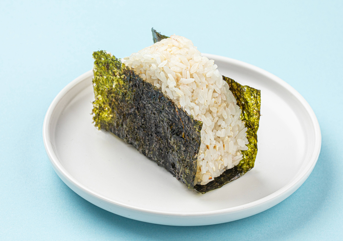 - Оберните онигири листьями нори по всему периметру.