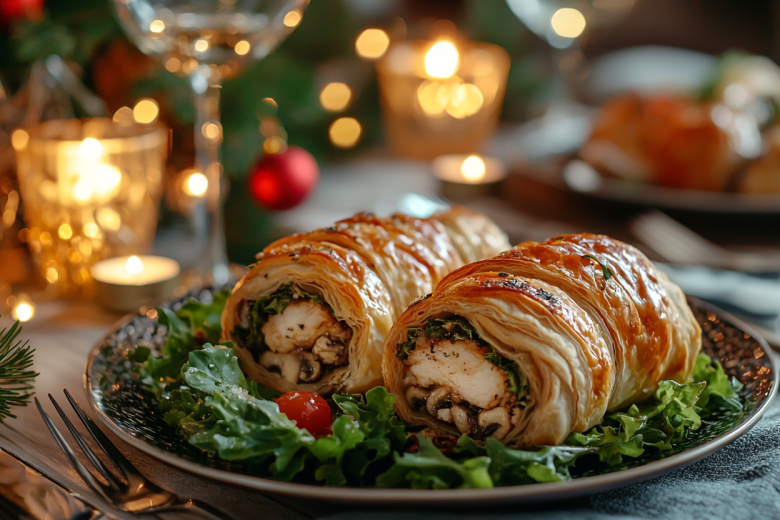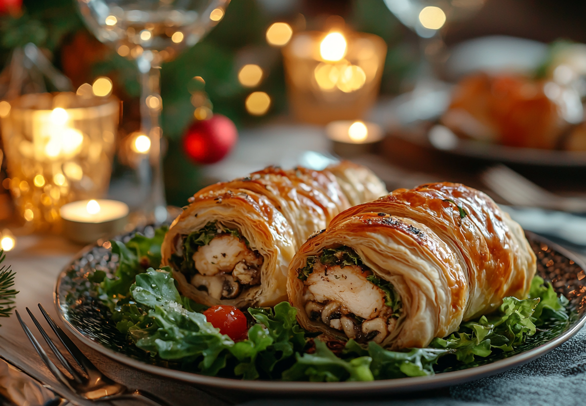 Вам понадобится: 2 куриные грудки, 500 г слоеного теста, 200 г сыра, 150 г грибов, 2 зубчика чеснока, 1 яйцо для смазки, соль, перец, прованские травы. Куриные грудки разрежьте вдоль на пластины, отбейте, посолите и поперчите. На каждую грудку выложите начинку: тертый сыр, обжаренные с чесноком грибы. Плотно сверните рулетиками. Слоеное тесто раскатайте, разрежьте на полосы. Каждый рулетик заверните в полосу теста, смажьте взбитым яйцом. Выпекайте 25–30 минут при 180°C до золотистой корочки.